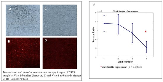 We observed no significant decrease in microcomedone density on the analysed samples; however, the intra-group analysis by visit, illustrated in Figure 5, shows the decrease in the surface ratio of microcomedones between the baseline visit and visit 4 (6 months). This evolution represents the decrease in overall microcomedone quantity on CSSS and is highly significant (p = 0.0003). The poor samples collected at visit 6 (12 months) did not allow us to reach statistically significant results because the COVID-19 pandemic strongly interfered in the study conduct.