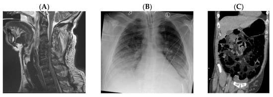 (A–C). (A) MRI cervical spine demonstrating a spinal cord contusion from C4 to C6. (B) Chest X-ray showing bilateral basilar consolidations suggestive of pneumonia and bilateral pleural effusions, which is worse on the right compared to the left. (C) CT abdomen and pelvis showing multiple loops of dilated bowel concerning for an ileus.