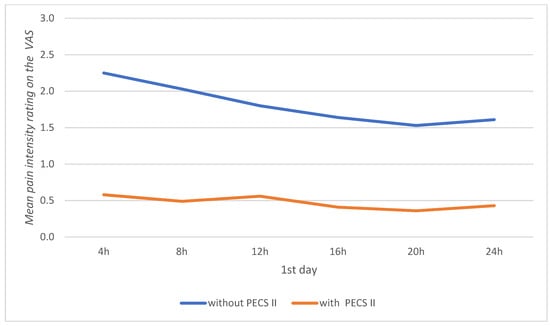 Mean pain intensity rating on the Visual Analog Scale (VAS) during the first 24 h in patients without the PECS II block and with the PECS II block.