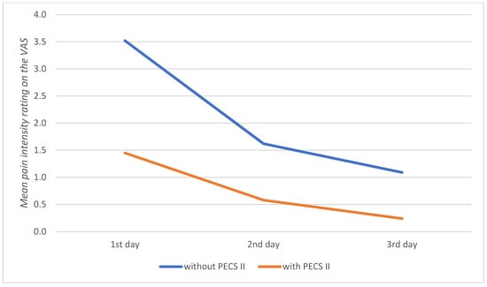 Mean pain intensity rating on the Visual Analog Scale (VAS) during the first, second, and third postoperative days in patients without the PECS II block and with the PECS II block.