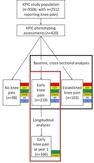 - Fernandes, G.S.; Sarmanova, A.; Warner, S.; Harvey, H.; Akin-Akinyosoye, K.; Richardson, H.; Frowd, N.; Marshall, L.; Stocks, J.; Hall, M.; et al. Knee Pain and Related Health in the Community Study (Kpic): A Cohort Study Protocol. BMC Musculoskelet. Disord. 2017, 18, 404. [Google Scholar] [CrossRef]