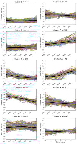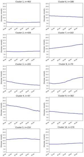 Three clusters (clusters 3, 8, and 10) showed close to normal or slightly elevated glucose levels at the beginning of the time interval (mean levels < 10 mmol/L) but with different dynamics during the night. Cluster 3 was characterized by a decrease in glucose levels, cluster 8 had a pronounced upward trend, and the glucose level in cluster 10 was stable.