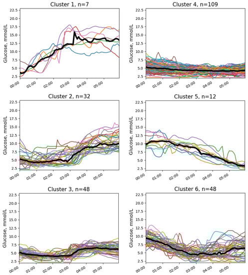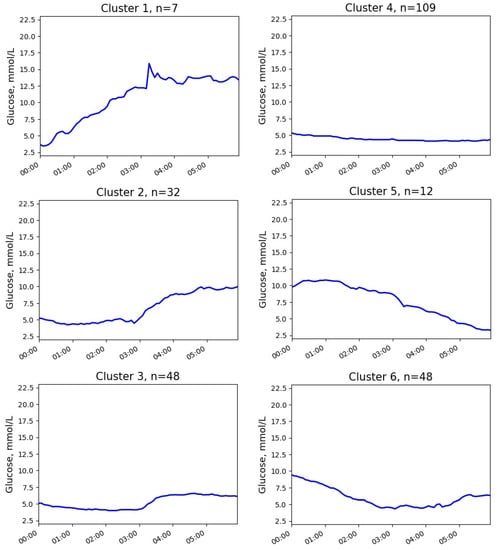 In this study, we applied cluster analysis to CGM data to identify different patterns of interstitial glucose fluctuations at night in people with T1D managed with multiple daily insulin injections (MDIs). Clustering analysis is applied in medical research for mining knowledge and classifying patients, events, laboratory data, etc. []. In diabetology, cluster analysis techniques were used for the identification of diabetes subtypes []. In some recent studies, the clustering of CGM data was applied to different clinical tasks. Kahkoska et al. identified three dysglycemia clusters in youth with T1D based on CGM parameters measuring hypoglycemia, hyperglycemia, and glucose variability []. Schroder et al. applied clustering algorithms for the classification of postprandial glycemic patterns in T1D subjects under closed-loop control []. Tao et al. recognized four glucose clusters in patients with type 2 diabetes (T2D) based on CGM and clinical data []. Li et al. extracted and clustered the trend components of CGM data to assess and predict the effect of treatment on T2D []. In the study by Varghese et al., “time in range profile”, “hypo profile”, and “hyper profile” were identified from the CGM data of patients with T2D []. Inayama et al. categorized the CGM data of women with gestational diabetes into three clusters depending on glucose level and variability [].
