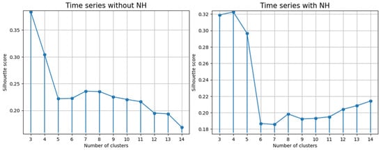 The index value in both cases was close to 0, but nevertheless, it was a positive indication that clusters intersect and overlap each other. The time series with NH had SS values slightly higher than those without.