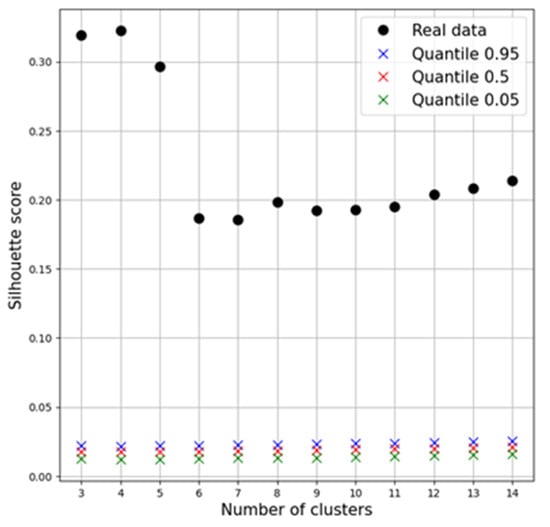 In a study by Kirilyuk IL and Senko OV [], clustering was considered reliable for a given number of selected clusters if the index value on the real sample turned out to be greater than the value of the quantile of the p level for artificial data (in our case, p = 0.95). However, the method proposed did not take into account the fact that clustering objects are time series. Since time series usually have a dependency between neighboring components, this means that many time series have autocovariance. Thus, to assess the statistical reliability of clustering structures, we used the Monte Carlo method and took into account the autocovariance of the clustered time series for the first few lags. In our work, the autocorrelation was taken into consideration for generating time series. This made it possible to make the artificial data more similar to the real data.
