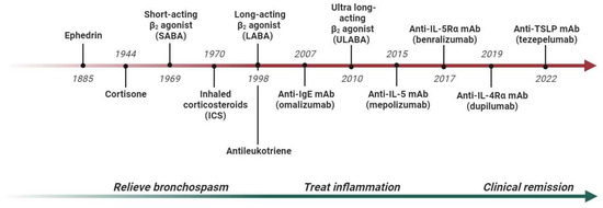 Development of asthma treatment and outcomes from the 19th century to the 21st century. Abbreviations: IL, interleukin; mAb, monoclonal antibody.