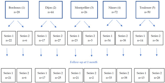 A total of 220 patients were included in the study in five participating centers, 110 in each series (Figure 1 flow chart). Of these, 204 patients completed their one-month follow-up.