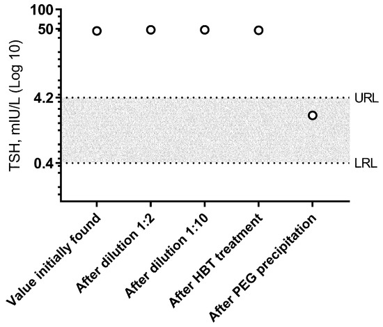 During our first visit, the patient presented a history of intermittent atrial fibrillation, obstructive sleep apnea syndrome, and current obesity (BMI 31 kg/m2). Non-thyroid therapy included bisoprolol, olmesartanmedoxomil/idroclorotiazide, rivaroxaban, and ezetimibe/simvastatin. Through an ultrasound, the thyroid showed a normal echostructure. Since the TSH value was not extremely high to trigger the immediate conclusion of assay interference (<50 mIU/L), we initially ruled out gastrointestinal malabsorption, and TSHoma was also excluded through magnetic resonance of the pituitary gland. Then, the thyroid therapy was adjusted to LT4/LT3 doses of 1.76 mcg/kg and 0.17 mcg/kg, respectively. TSH was measured using the electrochemiluminescence method on a Cobas® 6000 modular analyzer (Roche Diagnostics International Ltd., Rotkreuz, Switzerland). Since TSH did not change over time (i.e., 36.7 mIU/L, 53.2 mIU/L, 51.7 mIU/L, and 46.3 mIU/L in August 2023), we considered the potential presence of assay interferences and started laboratory work. Firstly, TSH was measured following serum dilutions (1:2 and 1:10) with a value of 48.4 mIU/L (recovery, 104.5%) and 48.3 mIU/L (recovery, 104.3%), respectively. Secondly, the sample was treated to exclude the presence of heterophile antibodies using a Heterophilic Blocking Tube (HBT) (Scantibodies Laboratory, Inc., Santee, CA, USA), resulting in a TSH of 47.5 mIU/L (recovery, 102.6%), thus excluding possible interference. Finally, the sample was treated with PEG precipitation to remove high-molecular-weight proteins, which includes macro-TSH. The result we achieved was a significant reduction in TSH levels to 2.22 mIU/L with a recovery rate of 4.76%. Thus, we concluded that the condition was macro-TSH. Figure 1 illustrates the TSH values recorded during the clinical investigation.