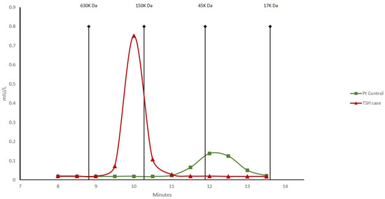 SEC was performed on the patient sample and a control with elevated TSH levels (Figure 2). A plasma sample diluted 1:10 with PBS (pH 7.4) was fractionated on an AdvancedBio SEC 300A coupled with an AdvancedBio SEC 130A column (PBS pH 7.4, 0.2 mL/min) via 1290 HPLC Agilent Technologies. Fractions of 0.5 min were collected, and TSH was analyzed using Cobas 8000 e801 (Roche diagnostics). The TSH of the control patient sample eluted between 48 KDa and 23 KDa according to the theoretical 28 KDa molecular weight, while the case-study patient sample eluted between 223 KDa and 152 KDa according to the sum of the immunoglobulin and TSH (theoretical, 178 KDa).