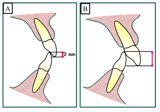 Definition of an overbite as a vertical relationship or the distance between the maxillary central incisor and the opposing mandibular central incisor. (A) shows a physiological overbite of 2–3 mm, and a deep bite caused when overbite increased by more than 3 mm is shown in (B).