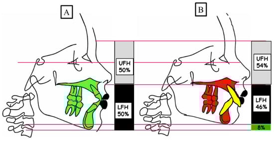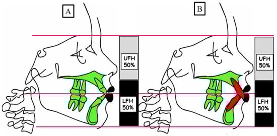 Schematic representation of the vertical dimension for a physiological overbite (A) and the combination of skeletal and dentoalveolar deep bite (B). (A) Physiological vertical dimension; harmonious relation between the upper facial height (UFH 50%) and lower facial height (LFH 50%). (B) A skeletal and dentoalveolar deep bite because of the anterior rotation of the mandible and elongation of the front teeth. There is a decreased lower facial height (LFH 46%) compared to the upper face height (UFH 54%).