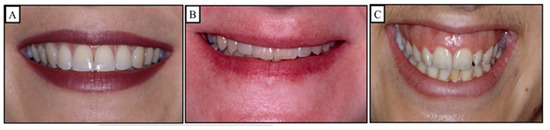 The different types of smiles. (A) shows an “Average smile”; the typical incisor exposure is 75–100% of the front tooth length. (B) shows a low smile; the typical incisor exposure is less than 75% of the front tooth length. (C) shows a “high smile”; the typical incisor exposure is more than 100% of the front tooth length with the appearance of the gingiva more than 2 mm.