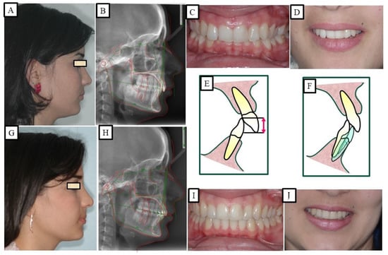 A patient with a deep bite. The treatment was achieved via the intrusion of the mandibular anterior teeth and simultaneous extrusion of the posterior teeth. (A–E) show before orthodontic treatment and show an average smile; therefore, the intrusion was performed in the mandibular anterior teeth. (F–J) show after orthodontic treatment.
