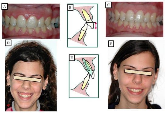 A patient with a deep bite and gummy smile, and the treatment was achieved by the intrusion of the maxillary anterior teeth. (A–C) show before orthodontic treatment, where the patient showed a high smile; therefore, the intrusion was performed in the maxillary anterior teeth. As a result of the intrusion and minimal gingivectomy, the gammy smile was significantly reduced or eliminated. (D–F) show after orthodontic treatment.