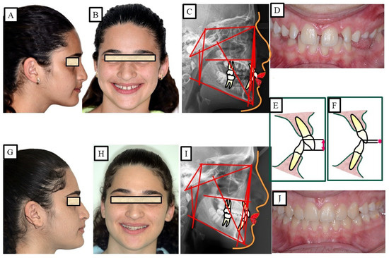 A young patient with dentoalveolar deep bite and average smile. The deep bite is corrected by the intrusion of the front teeth (especially the front of the lower jaw) and the extrusion of the posterior teeth. (A–E) show the case before orthodontic treatment, while (F–J) show after orthodontic treatment.