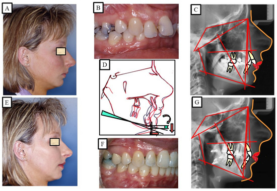 An adult patient with Class II dysgnathy and deep bite (skeletal and dentoalveolar). The correction of skeletal Class II and skeletal deep bite is performed via intrusion of the frontal teeth and combined orthodontic surgical treatment. Posterior rotation of the mandible during surgical mandibular advancement caused bite elevation and lengthening of the lower facial height. (A–C) show before orthodontic surgical treatment. (D) shows the over-positioning of the pre-treatment (black) and post-treatment (red) radiographs due to the changes in the sagittal and vertical dimensions. The surgical rotation of the mandible caused the opening of the mandibular angle, which led to the lengthening of the lower facial height. (E–G) show after orthodontic treatment.