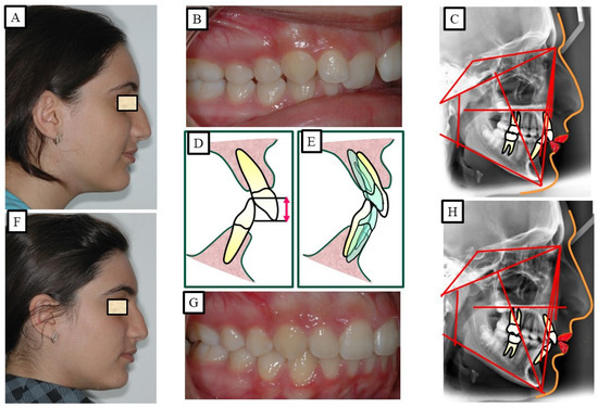 An adult patient with Class II dysgnathy and deep bite (skeletal and dentoalveolar). The correction of skeletal Class II and the skeletal deep bite is performed via camouflage therapy, intrusion and protrusion of the frontal teeth, and extraction of the posterior teeth. (A–D) show before orthodontic surgical treatment, while (E–H) show after orthodontic treatment.