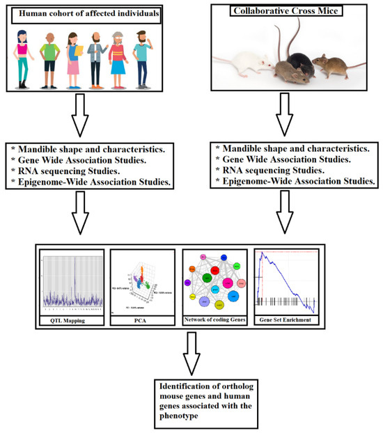 The knowledge gained from mouse models and CC populations can be translated into human dentistry, improving diagnostic and therapeutic strategies. Understanding the genetic and environmental factors underlying deep bite in mouse models enables researchers to identify potential biomarkers and genetic risk factors in humans. These findings may inform the development of targeted interventions and personalized treatment approaches. Furthermore, mouse models allow for preclinical testing of novel therapeutic interventions, such as gene therapies or pharmacological treatments, before translating them into clinical trials [29,37]. The workflow diagram for the generation of system genetic datasets of cellular, molecular, and clinical trait data combined to analyze various correlations between malocclusion and deep bite phenotypes in human and mouse models are represented in Figure 15.
