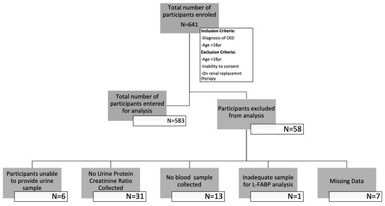 A 20 mL urine sample was provided as part of the participants’ routine clinical care. Then, 10 mL was analysed by the participating centres’ local NHS biochemistry laboratories to measure urinary protein, creatinine and the protein: creatinine ratio (uPCR). The remaining 10 mL sample was stored at −80° pending measurement of uL-FABP levels using an Enzyme-Linked Immunosorbent Assay (ELISA).
