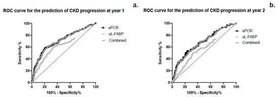 (a,b) ROC curve analysis of the sensitivity and specificity of urinary L-FABP, PCR and the combined effect of the 2 biomarkers in predicting CKD progression at years 1 and 2.