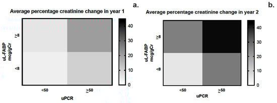 (a,b) Heat map analysis of the average change in creatinine at years 1 and 2 stratified by urinary L-FABP and PCR levels.