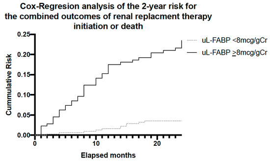 Cox regression for the combined outcomes of death and initiation of RRT over the 2-year study period showed that the cumulative risk for patients with high uL-FABP levels (using uL-FABP of 8 as the differentiator) was significantly higher than those with low levels (p < 0.001) in a model adjusted for age, sex and uPCR (Figure 6).