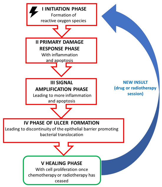 Five-step model defining pathogenesis of mucositis. Adapted from Touchefeu et al., 2014; Elad et al., 2020; McQuade et al., 2020 [13,14,15].