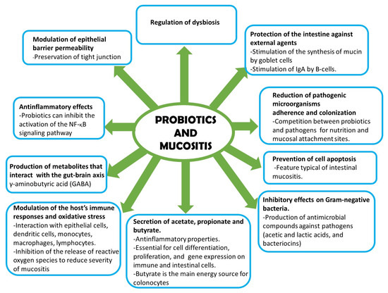 The main mechanisms of action of probiotics to improve intestinal mucositis are summarized in Figure 2 [26].