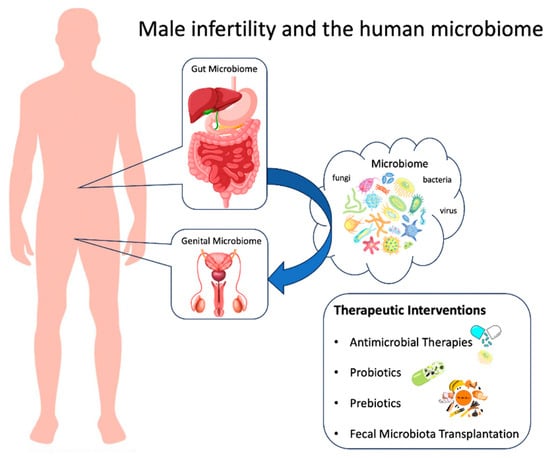 Research on the microbiome primarily centers on the gastrointestinal tract, which houses a significant portion of microbial organisms. Recent studies have drawn attention to the correlation between gut microbiota dysbiosis and male infertility, suggesting its potential significance in clinical practice [78,79,80].