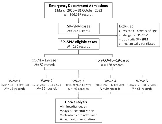 A retrospective analysis of the electronic medical records (EMRs) was conducted, and 206,097 patients who presented at EDs were retrieved. The inclusion criteria were age above 18 years, presence of SP–SPM confirmed with chest X-ray or computed tomography (CT), and rapid antigenic testing and/or reverse transcription–polymerase chain reaction (RT–PCR) test for SARS-CoV-2 infection. The exclusion criteria were age below 18 years, post-traumatic SP–SPM, and iatrogenic or post-mechanical ventilation SP–SPM.