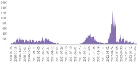 Public data regarding the daily number of COVID-19 cases were retrieved from the Centre for Transmissible Disease Control of Timisoara City Council website []. The time spells corresponding to the pandemic waves were determined based on the reports from the National Institute of Public Health [] and corroborated with the results from a recently published study conducted in “Victor Babes” Clinical Hospital for Infectious Diseases and Pulmonology in Timisoara []. We were, thus, able to document the wide range of cumulative cases over the five pandemic waves. Nevertheless, it should be noted that, during the first two waves, there were no standard protocols for the management of patients suspected or confirmed to have COVID-19. Table 1 and Figure 2 show the details of the five pandemic waves.