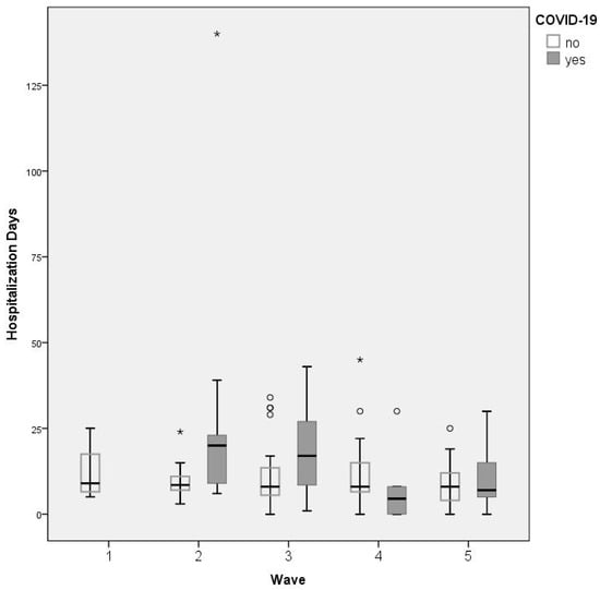 Table 5 synthesizes the outcomes related to the study objectives. Figure 3 shows the box-plot diagram of the length of hospitalization across the five waves. There are many outliers and extreme values (open bullets and stars, respectively) in all waves, but there is a particularly high extreme value in Wave 2 for a COVID-19 case. The lack of a distinctive pattern is easily observable.