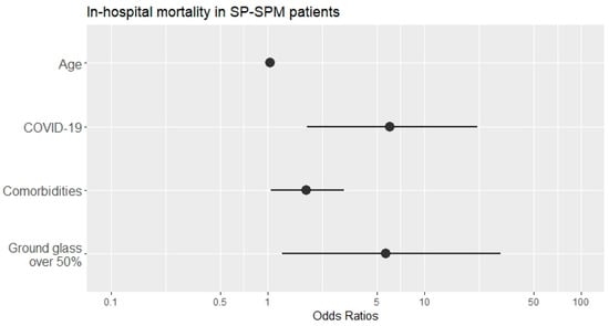 The pandemic waves had no significant effect on the risk of death. Table 6 summarizes the results of the logistic regression analysis related to in-hospital mortality as the outcome: the mortality was highly dependent on the presence of COVID-19, the increased number of comorbidities, and the presence of ground-glass opacities over 50%. The odds ratio (OR) values of the significant predictors and their corresponding confidence intervals on a logarithmic scale are depicted in Figure 4. Although some of these intervals are large (such as those for COVID-19 condition and the presence of ground-glass opacities), implying imprecision, the Nagelkerke R-square value (i.e., R-square = 0.524) demonstrates the model’s good prediction performance: these four predictors would explain more than 50% of the SP–SPM mortality when controlling for gender, smoking habits, pandemic wave, and extension of SP–SPM. On the other hand, the OR value for age is very close to 1 with a highly tight confidence interval, thus implying little impact on the outcome (statistically significant nonetheless).