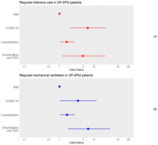 The independent predictors for required intensive care (a) and mechanical ventilation (b) in patients with SP–SPM as resulted from the logistic regression analysis. The dots correspond to the estimated OR values (shown in Table 7 and Table 8, respectively), and the lines depict the 95%CI intervals. The horizontal axes employ a logarithmic scale.