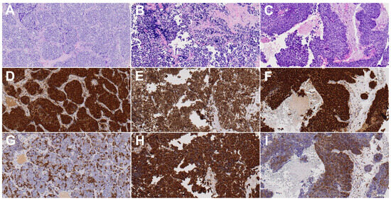 The antibodies for the Sox2 and βIII-tubulin expression analysis were rabbit anti-Sox2 AB5603 (Millipore Ibérica SA Madrid, Spain) and mouse anti-Btub-III G712A (Promega, Madison, WI, USA), both applied at a dilution of 1:1000, with an antigen retrieval incubation time of 20 min at 95 °C in a citrate buffer (pH 9.0). Negative controls were prepared by omitting the primary antibody. The immunohistochemical results were evaluated independently by three observers (L.F-V., B.V., and V.B.L.) without knowledge of the clinicopathological outcomes of the patients. In samples where there were discrepancies, they were solved afterwards by looking together using a multi-head microscope, and a consensus was reached. Sox2 expression was scored as positive when >5% of cells showed nuclear expression [50,51,52]. βIII-tubulin was scored by intensity (0, 1, 2, or 3) and percentage of positivity (1 as <30%, 2 as 30–70%, and 3 as >70%); the multiplication factor of both scores produced negative staining when 0, weak staining when 1–2, moderate staining when 3–4, and strong staining when 6–9 [40]. Representative Sox2 and βIII-tubulin staining images of the three tumor types (SNUC, ONB, and SNEC) are shown in Figure 1.