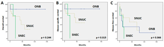 The 5-year overall survival (5-yr OS) rates were 86%, 40%, and 0% for all ONB, SNUC, and SNEC cancer patients, respectively (Figure 2). Similar figures were observed for the 5-year disease-specific survival (5-yr DSS) (Figure 2). The median disease-free times were 14 months (95% CI: 7–21) for ONB, 16 months (95% CI: 1–40) for SNEC, and 48 months (95% CI: 1–104) for SNUC. The 5-year disease-free survival (5-yr DFS) rates were 34%, 48%, and 0% for all ONB, SNUC, and SNEC patients, respectively (Figure 2). The main causes of death were local recurrences and distant metastases. At the time of writing, a total of 15 of 26 patients (57%) remained alive without disease. We observed no significant relations between OS, DSS, or DFS and clinical parameters such as gender, age, location, or tumor stage.