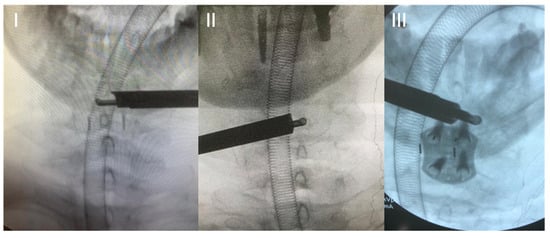 Intraoperative radioscopic images. Decompression of the base of the spinous process (I,II). Positioning of the working cannula and instrument during contralateral decompression (III).