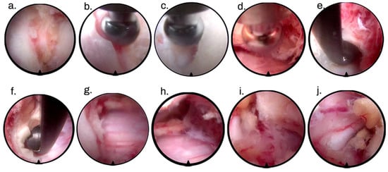 Intraoperative images of central and over-the-top cervical full-endoscopic decompression. Point identification of V or Y (a). Opening of the cranial (b) and caudal (c) lamina. Decompression of the base of the spinous process (d). Opening of the contralateral caudal (e) and cranial (f) lamina. Final aspect of contralateral decompression (g,h). Ipsilateral foraminotomy surrounding the caudal pedicle (i), and final image of the ipsilateral foraminotomy (j).