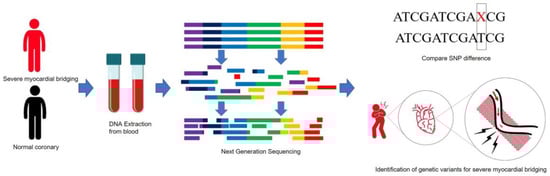 The supply of blood to the heart depends on coronary arteries, which are normally distributed in the epicardial space on the surface of the heart. The diastolic phase accounts for most blood flow perfusion to the coronary arteries, meeting the metabolic demands of the heart. Myocardial bridging (MB) is a coronary vascular anomaly where coronary vessels are embedded into heart muscles, making a “bridge” of the muscle band above the feeding vessel, resulting in vascular compression during heart contractions (Figure 1) [1,2]. Because MB squeezes the luminal tunnel of the affected vessel and hampers coronary blood flow, the distal blood perfusion of cardiac tissues would be compromised. Consequently, chest tightness or exertional chest pain may occur, whenever strenuous cardiac muscle contraction is induced, mimicking atherosclerotic coronary artery disease (CAD). Although MB was reported to alleviate atherosclerotic processes of the affected vessel, the proximal end of the MB segment has a higher probability of atherosclerosis due to blood stasis, focal turbulent flow, and shear-stress-related endothelial damage [3,4]. MB causes myocardial ischemia, and the subsequent hemodynamic consequence could not be ignored due to ischemic cardiomyopathy [5]. In a meta-analysis, MB was shown to be associated with an increased risk of adverse cardiac events, non-fatal myocardial infarction, and hospitalization for chest pain [6]. Clinically, the spectrum of symptoms from MB spans extensively. MB can be asymptomatic or manifest as minor angina to severe chest pain [7]. In some rare cases, major cardiac events or life-threatening ventricular arrhythmias may occur during extreme exercise [8,9,10]. The presence of MB was reported to increase the risk of fatal arrhythmia among those with hypertrophic cardiomyopathy and those who underwent implantable cardioverter defibrillator or heart transplantation [10,11,12]. A significantly elevated risk of in-hospital death was demonstrated among Takotsubo cardiomyopathy patients with versus without MB [13]. It seems reasonable to detect MB as early as possible to prevent a potential major event. MB has a male preponderance [14]. The prevalence of MB differs depending on the tools used for screening, ranging from 2% to 6% via invasive coronary angiography to 40% according to autopsies [7,15]. Although the number of reports on the topic is limited, MB with severe systolic luminal compression (SMB) is rare. Consequently, in some areas, patients with MB are prohibited from military service or training. The clinical presentations and exaggerating factors of MB mimic those of CAD [7]. Noninvasive evaluation modalities for ischemic heart disease, such as echocardiography, a treadmill test, or a nuclear medicine cardiology examination, are not effective in distinguishing between MB and CAD. To exclude the possibility of CAD, patients with MB and angina often have to undergo invasive coronary angiography or contrast coronary computed tomography (CT), both of which entail exposure to ionizing radiation [16]. So far, there is not a reliable, rapid, noninvasive, and cost-effective diagnostic method to identify the presence of myocardial bridging among anginal patients with low-risk profiles of coronary artery disease. Next-generation sequencing (NGS) has the potential to be a new alternative tool to CT and invasive angiography for rapidly and accurately diagnosing MB.