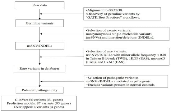 The definition and criteria for pathogenic variants were as follows: (A) ClinVar (version 20210501), those with conflicting evidence of pathogenicity, those likely pathogenic, pathogenic, or those pathogenic/likely pathogenic; (B) CADD Phred score > 20, indicating inclusion in the top 1% of the most pathogenic variants [49,50,51]; and (C) REVEL raw score > 0.75, calculated on the basis of 13 independent tools, with a higher score indicating a greater likelihood that the variant causes disease [52]. Gene expression levels among human tissues were viewed through the GTEx Portal (https://gtexportal.org/home/ accessed on 1 April 2022). Please refer to Figure 2 for study protocol.