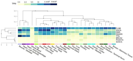 Genes with rare variants pathogenic for SMB from Table 1 and Table 2 were further examined according to the expression levels among cardiovascular and myocardial tissues. The Genotype-Tissue Expression (GTEx) Project was used to further investigate the expression of the genes harboring rare pathogenic variants in muscle and artery tissues. TTN, DMD, and SGCA exhibited high expression levels in the muscle and heart tissues (Figure 4). DMD and SGCA were also highly expressed in the artery tissues.