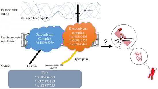 SGCA encodes a protein called “sarcoglycan-alpha”, a component of the dystrophin–glycoprotein complex that stabilizes cell membranes to the ECM [35]. Sarcoglycan alpha is one of the major sarcoglycan proteins assembled on the plasma membrane of striatal muscle fibers, including cardiomyocytes and skeletal muscle. Sarcoglycanopathy is an evolving science regarding a rare autosomal recessive hereditary muscular dystrophy affecting limb girdle muscles [36]. The sarcoglycan complex, along with the dystroglycan complex, functions as a connector between the cytoskeleton of the muscle fiber and the ECM, augmenting mechanical support during muscle contraction [37]. SGCA is highly expressed in striated muscles, and the heart has the highest expression levels (Figure 4). Because protein products from SGCA account for the structural stability between cardiomyocytes and the surrounding connective tissues [38], deformed SGCA products might result in a loosened myocardial mass structure and, thus, a tendency of coronary vasculature deviation into the myocardium. An animal experiment was once performed using Sgca-null mice for the characterization of cardiac structure and global functions, from which a significantly thickened interventricular septum and posterior wall, accompanied by the dilated left ventricular chamber, were recognized among Sgca-null mice [39]. However, there is no angiographical characterization study for Sgca-null mice so far. An animal study indicated that Sgcd-null mice had irregularities of the coronary vessels [40]. However, the effect of SGCA on the cardiovascular system remains unknown. Sarcoglycans are integrated into the dystrophin glycoprotein complex (DGC) and function as the fundamental anchor between cardiomyocytes and the ECM [41]. Because animal models have demonstrated that the destabilization of DGC leads to membrane fragility and a loss of integrity [42,43,44], genetic variants of SGCA might have a role in SMB (Figure 5). Indeed, a further study to confirm these functional variants is required.