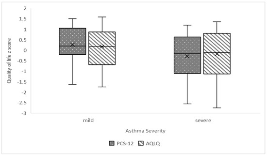 Figure 1 presents the boxplots of PCS-12 and AQLQ z-scores for mild and severe asthma groups, indicating the pattern of lower PCS-12 for the severe asthma group compared to the higher PCS-12 score for the mild asthma group.