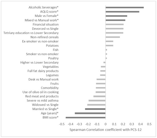 The ranked correlations presented in Figure 2 indicated a significant relationship between the PCS-12 score and Med Diet adherence and the recommended consumption of alcoholic beverages (r = 0.437, p < 0.05), more specifically the consumption of alcoholic beverages in accordance with the Mediterranean Diet suggestions, as well as a negative relationship with BMI score (r = −0.454, p < 0.010). Moreover, significant correlations were also present between the physical quality of life and AQLQ score and work type, as well as gender, age, and marital status. More likely to exhibit higher physical health-related quality of life were male participants who adhered to the Mediterranean Diet recommendation for alcohol consumption, had higher asthma-related quality of life, had mixed types of work, were single, younger, and had a lower BMI.