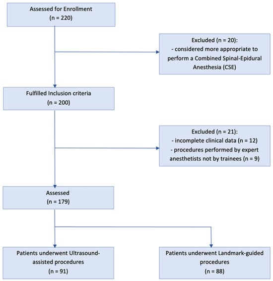 The inclusion criteria were as follows: patients scheduled for elective orthopedic surgery of the lower limb with single-shot spinal anesthesia; aged 18 years or older; patients with a body mass index (BMI) of 18–40 kg/m2 based on the weight the day prior to surgery and the height measured at admission to the hospital; American Society of Anesthesiologists (ASA) physical status classification of I to IV; and anesthesia performed by a supervised novice trainee. “Novice trainees” are operators with less than one year of loco-regional anesthesia training and less than 20 spinal anesthesia procedures performed. The exclusion criteria were as follows: contraindications to subarachnoid anesthesia (i.e., infection at the puncture site, coagulopathy, allergy to the local anesthetic, or refusal of the procedure); patients on whom was performed combined spinal–epidural anesthesia or epidural anesthesia only; incomplete clinical data recorded; and pregnancy.