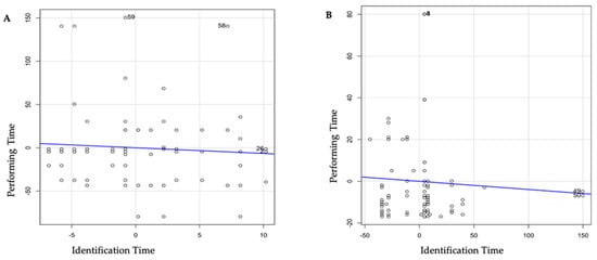 Linear Regression Model analyzing the relationship between procedure performing time and space identification time in the LG group (A) and the US group (B).