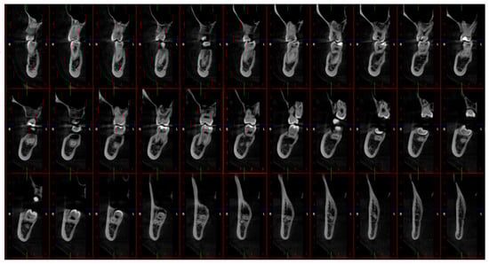 Snapshot of 33 cross-sectional images on Romexis 6.2 software (Planmeca oy, Helsinki, Finland): 0.25 mm thickness, sharpness, and contrast at zero.