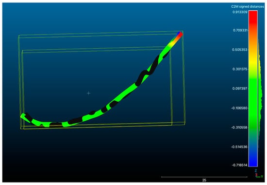IAC overlapping and visualization of 3D comparison deviation chromatogram on Cloud Compare v.2.13.alpha (open-source software, http://www.cloudcompare.org/ accessed on 7 April 2023). The blue color represents the minus direction of deviation, the red color represents the plus direction of deviation, and the green color represents the average value.