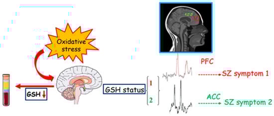 However, the contradictory results of GSH levels among studies (especially those using MRS) could be explained by a different vulnerability of the brain regions to oxidative damage. Accordingly, a different expression of glutathione in the diverse brain areas has been shown in mouse models, where a higher GSH expression may indicate a condition less prone to oxidative stress. Different human brain regions and subregions likely show different GSH expressions, and a GSH measurement conducted without distinguishing between the diverse areas may lose these differences. Thus, the initial baseline level of glutathione accounting for the propensity to an oxidative insult in the corresponding region should be considered. Furthermore, the oxidative damage could be explained by the glutamatergic hypothesis with a PV interneuron degeneration. All the circuitry affected by the interneuron damage may contribute to the specific SZ symptoms. Accordingly, Cabungcal et al. [97] showed that glutathione deficit induces the GABAergic interneuron degeneration in the ACC of an SZ rodent model system. A systematic investigation conducted to evaluate the possible association between ACC GSH levels and the different SZ symptoms, dissecting for example the different parts of ACC and anhedonia–asociality or avolition–apathy for the negative symptoms, would be a huge challenge. The MRS analysis coupled with GSH peripheral detection could allow for distinguishing between the different SZ states as long as they are conducted in precise brain areas relevant to functions correlated to specific signs (Figure 1).