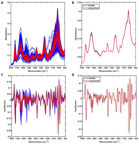 Mid-infrared (IR) spectra derived using ATR-FTIR spectroscopy. (A) Raw IR spectra for all sample in each group (lung cancer or other conditions [OTHER]); (B) average raw IR spectra for each group (lung cancer or other conditions [OTHER]). (C) Preprocessed (SG 2nd derivative followed by vector normalisation) IR spectra for all samples in each group (lung cancer or other conditions [OTHER]); (D) average preprocessed IR spectra for each group (lung cancer or other conditions [OTHER]).